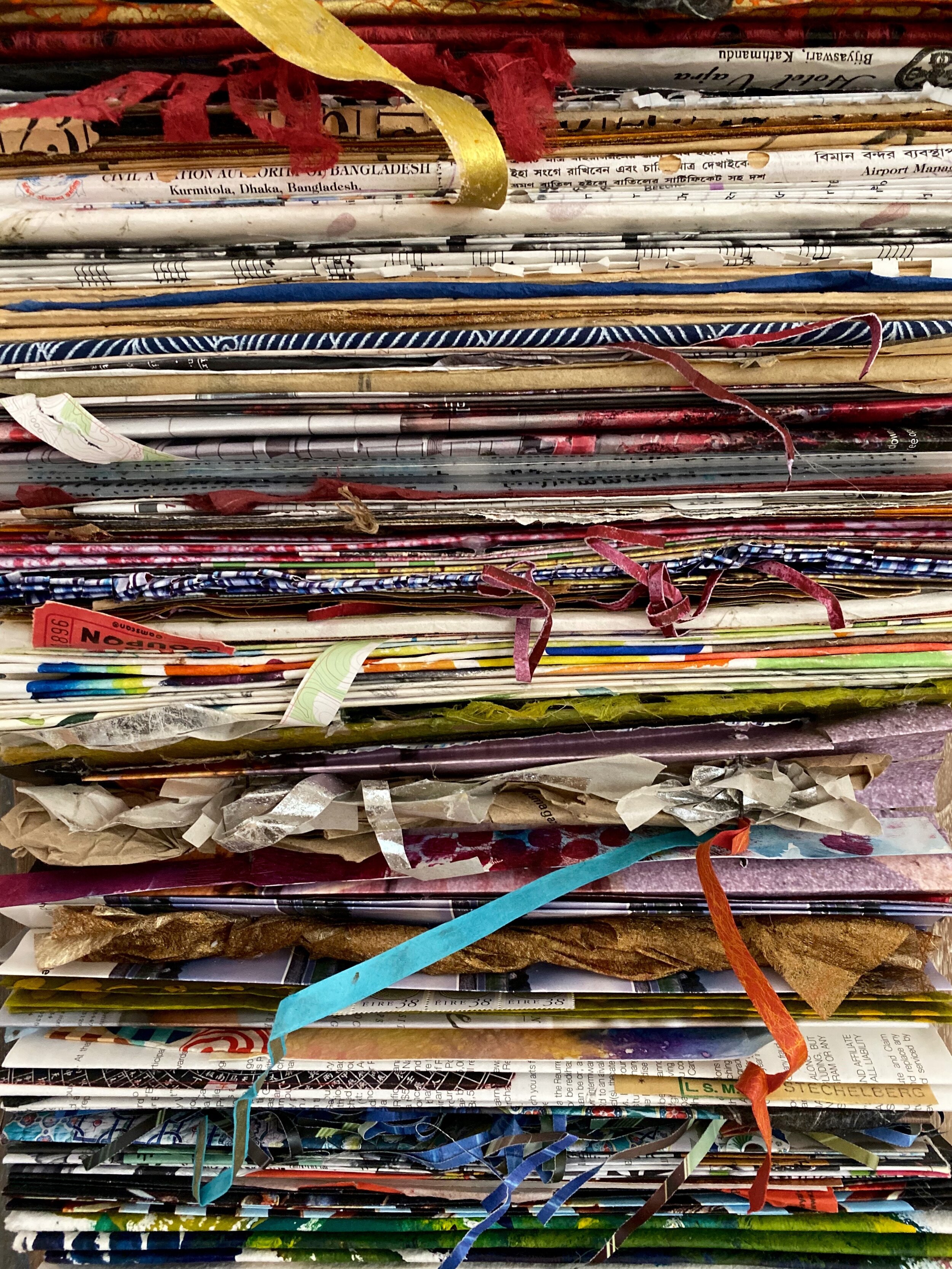I made the piece to the left after moving from my home of 35 years into a smaller space. As I emptied the attic and sorted box after box of documents, letters, old paintings, mortgage payments, journal pages, receipts, maps, tickets, ephemera from travels, sheet music, etc. I folded these papers and grouped them sequentially, finally tying them all together. The piece is my height and is a journal of sorts. I grew up in the Ozark's and watched my grandmothers and aunts crochet rag rugs with available rags, old dresses and any cloth bits. For me, this piece is reminiscent of those rugs and the instinct to make something from nothing.